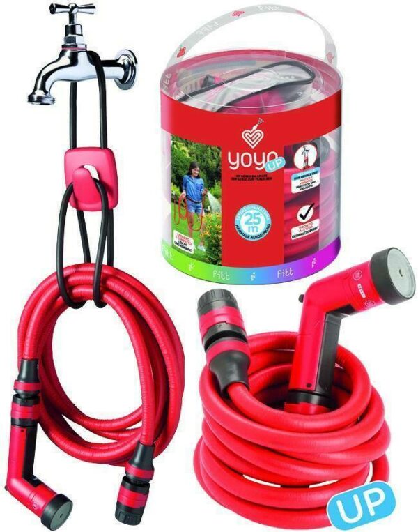 Innaffiare il giardino o lavare l`auto è sempre più semplice, pratico e piacevole grazie a YOYO, l`innovativo sistema firmato FITT leggero, compatto e pronto all`uso. Composto da tubo estensibile, raccordi e pistola multi-getto, YOYO è il prodotto versatile che ha rivoluzionato il mercato dei tubi da giardino. Ideale per innaffiare orti e giardini, per lavare mobili da esterno, auto, biciclette, giocattoli, da portare in campeggio e in barca, YOYO si allunga al passaggio dell`acqua in pressione di circa il doppio della sua lunghezza originaria per tornare, dopo l`uso, alla dimensione di partenza.